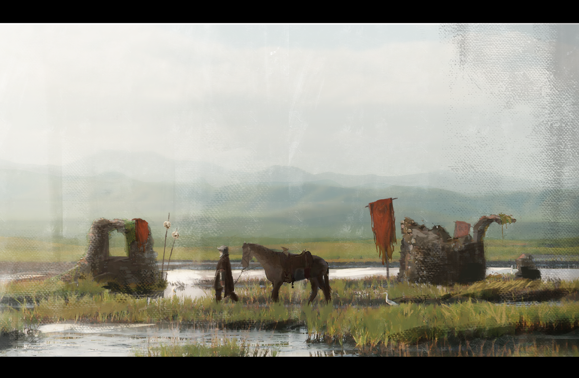 "To further imply that this environment was the aftermath of a battle, skulls on stakes and torn banners were added to the scene. Paint textures and other brushwork was used to blend the newly combined ruins and characters with the photograph layers. Adding black bars above and below the scene made the artwork feel more cinematic."